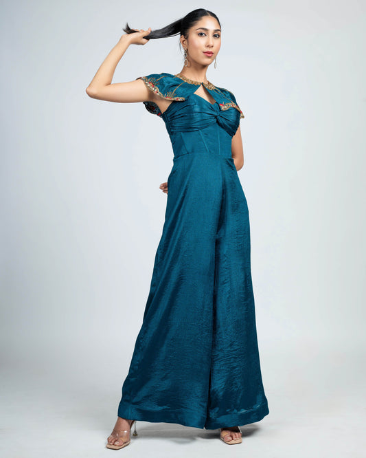 Teal Wide-Leg Jumpsuit with Embellished shoulder Cape