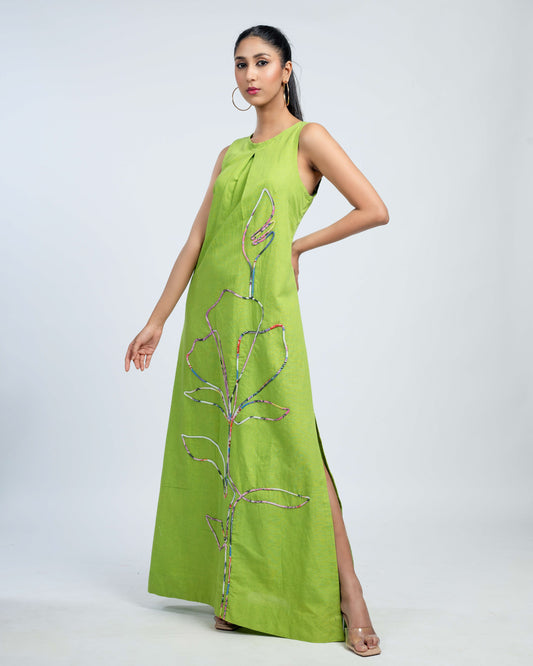 Green Sleeveless Maxi Dress with Pleated Front & Floral Embroidery