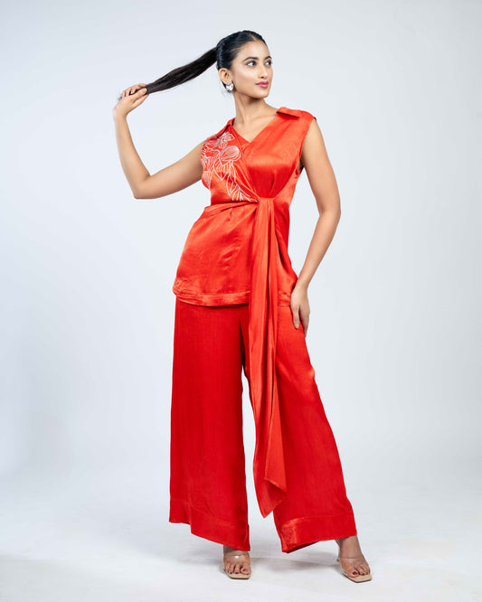 Rust Orange Sleeveless Wrap Top & Wide-Leg Pants Co-ord Set