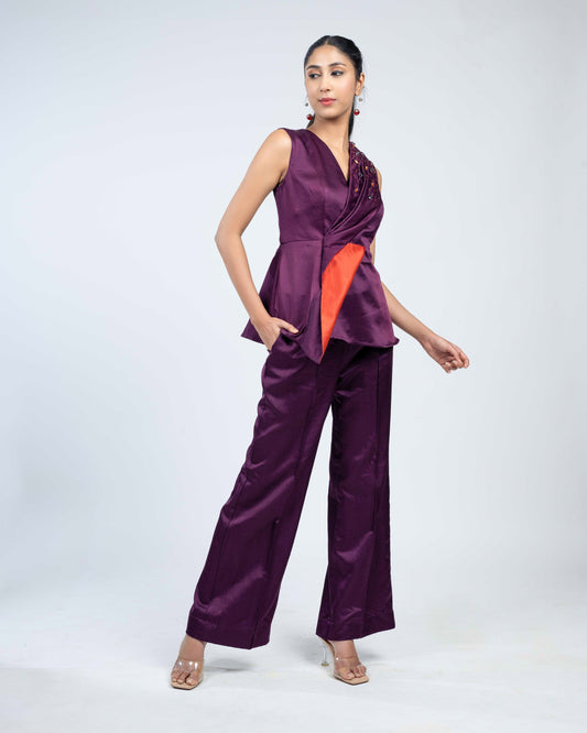 Plum Purple Silk Co-ord Set with Embellished Drape Detail