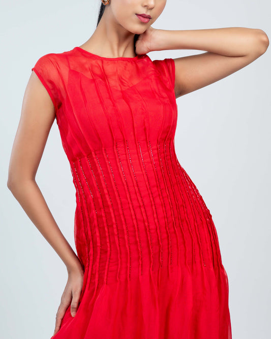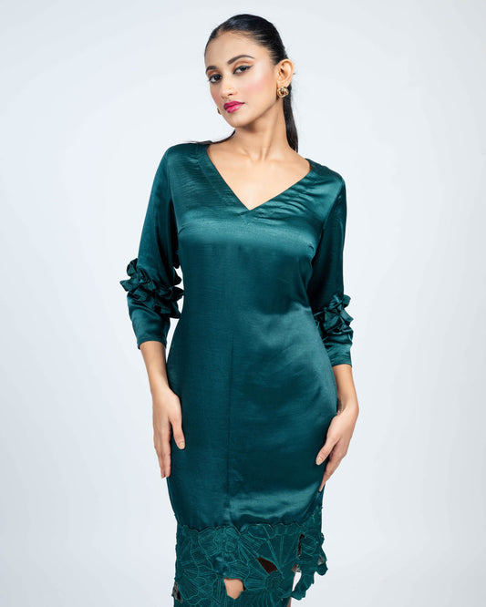 Emerald Green Satin Dress with Textured Hem & Ruffled Sleeves