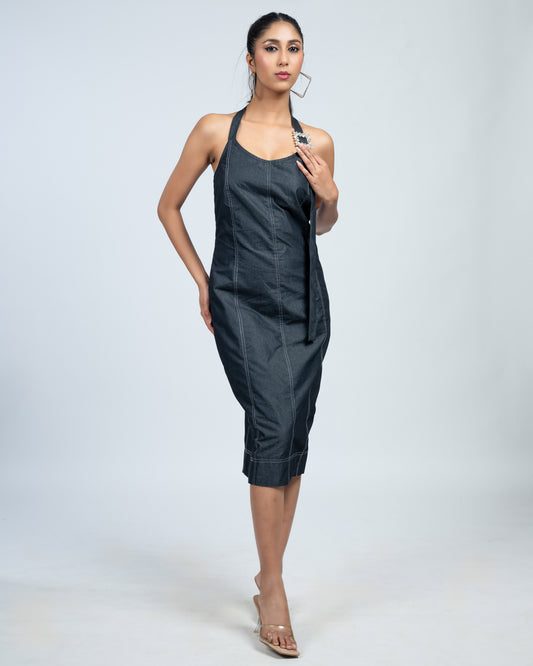 Black Halter Neck Denim Midi Dress with Statement Brooch