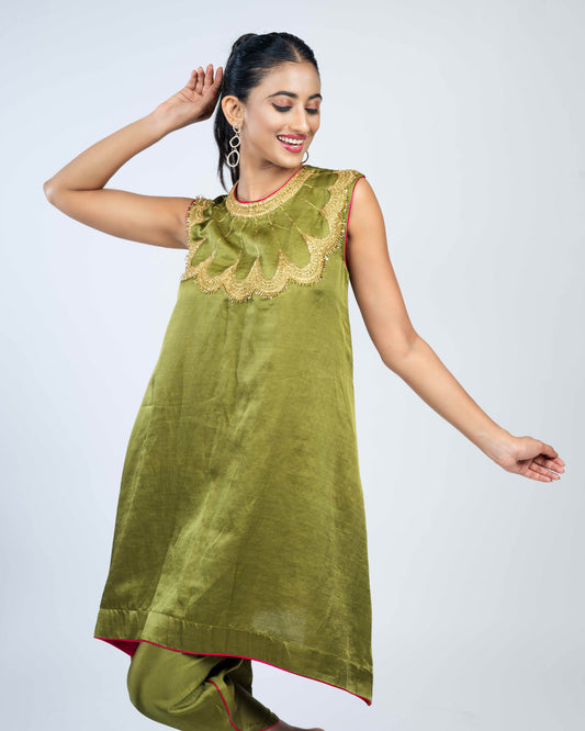 Olive Green Asymmetric Kurta Set with Pink Dupatta